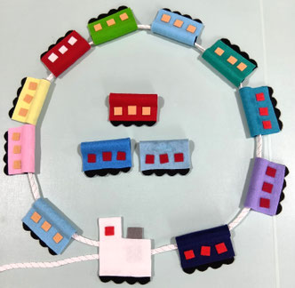 フェルトで電車を作り、ひもは靴ひもを使用しました。